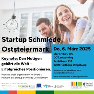 Ein Impuls von Michaela Eibel (Eigentümerin der Agentur M-Effekt & Mentorin der Startup Schmiede Oststeiermark) zum Thema „Den Mutigen gehört die Welt – Erfolgreiches Positionieren.“ und zwei Unternehmensvorstellungen aus der Oststeiermark runden das offizielle Programm ab.