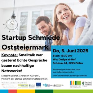 Netzwerkevent Startup Schmiede Oststeiermark: „Smalltalk war gestern! Echte Gespräche bauen nachhaltige Netzwerke!“ – Elisabeth Leitner, Gründerin von GOForIt und Mentorin der Startup Schmiede Oststeiermark, 5. Juni 2025, 16:30 Uhr